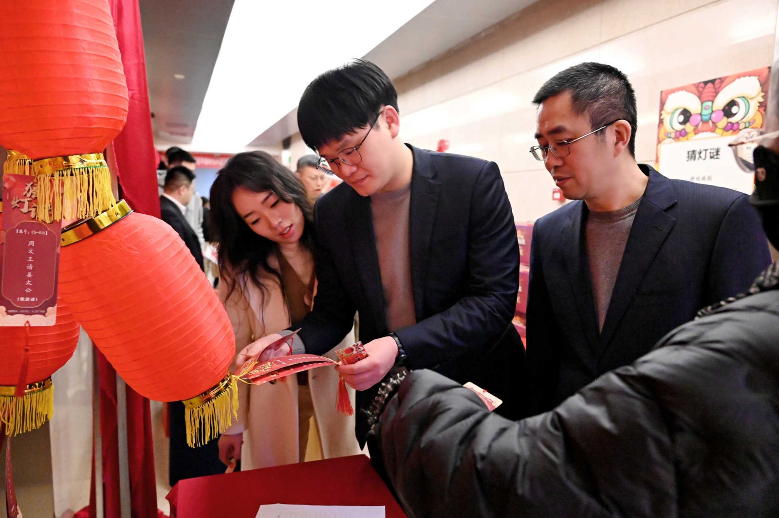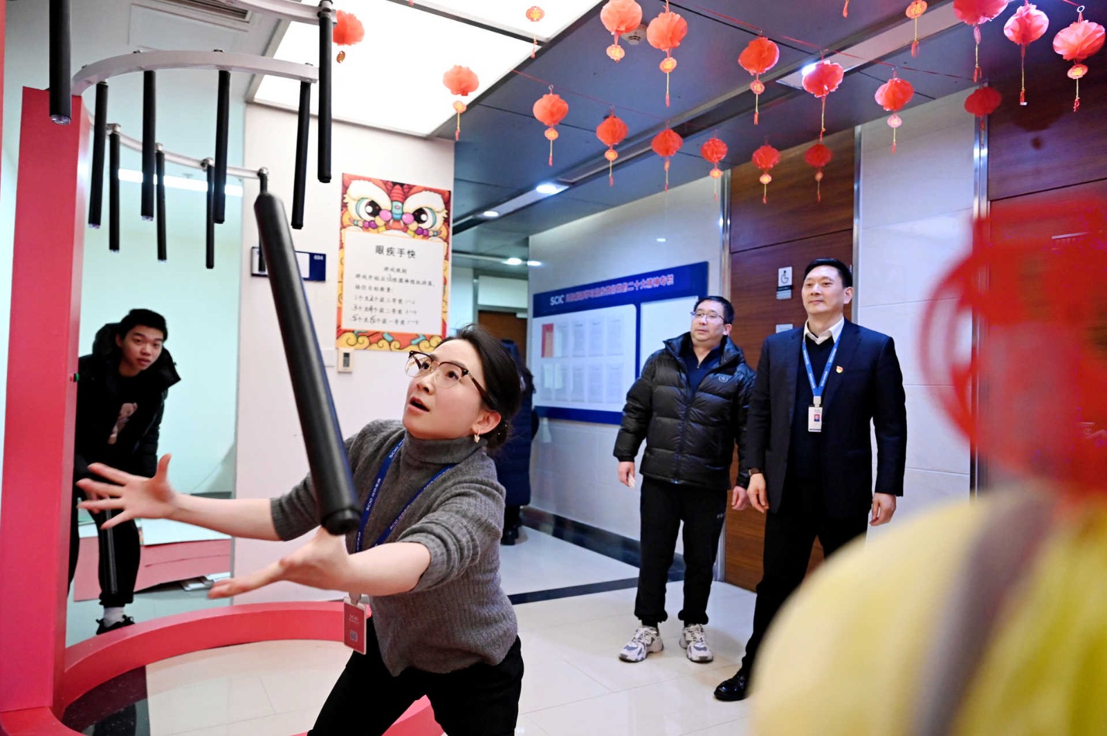 此次活動采用游園方式,現(xiàn)場設(shè)置了民俗體驗區(qū)、非遺手作區(qū)、民俗體驗區(qū)、新春互動區(qū)、游戲互動區(qū)等5個活動區(qū)域,涵蓋猜燈謎、剪窗花、做龍燈、滾滾樂等8個活動。活動現(xiàn)場每一處都用心裝扮,火紅的中國燈籠、精美的傳統(tǒng)對聯(lián)伴隨濃郁的新年味道彌散在會場的每一個角落。大家爭先恐后、玩勁十足,盡享新春的熱鬧與喜悅!有的圍著掛著紅線繩的燈謎卡片,仔細閱讀謎語,認真思考,沉浸在猜謎的樂趣中;有的圍在四川剪紙非遺傳承人莊叢燦老師周圍,一邊聆聽著剪紙的技巧,一邊仔細修理邊角,用心精雕細琢;有的在學習制作龍燈,他們展現(xiàn)出極高的熱情和創(chuàng)造力,根據(jù)自己的想象,給龍燈增添了各種裝飾,如彩紙、亮片等,使得每個龍燈都獨具特色。