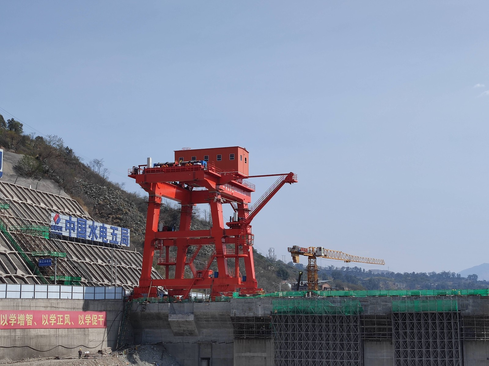 紅色門機迎江矗立?!按蟮踯囌鎱柡Γ賴嵲O備輕而易舉提抓起來!”今年以來,攀枝花廣大市民陡然發(fā)現(xiàn)銀江水電站大壩上架起了一個紅色的大型設備,從幾公里外的市區(qū)一眼望去就能映入眼簾,成為銀江水電站的新標志。這個紅色巨物就是壩頂門機,高25米,寬16米,最大起吊能力達到500噸,起升高度達75米。是水電站建設期金屬結(jié)構(gòu)安裝及后期電站運行最重要的設備之一,2024年將肩負起包括36扇閘門在內(nèi)共計超萬噸的設備起吊任務。為順利推進施工,開年以來,川投能源攀水電公司通過增加臨時軌道提前籌備、堅持春節(jié)不停工等措施,加快實施壩頂門機供貨安裝,計劃4月中旬投入使用。