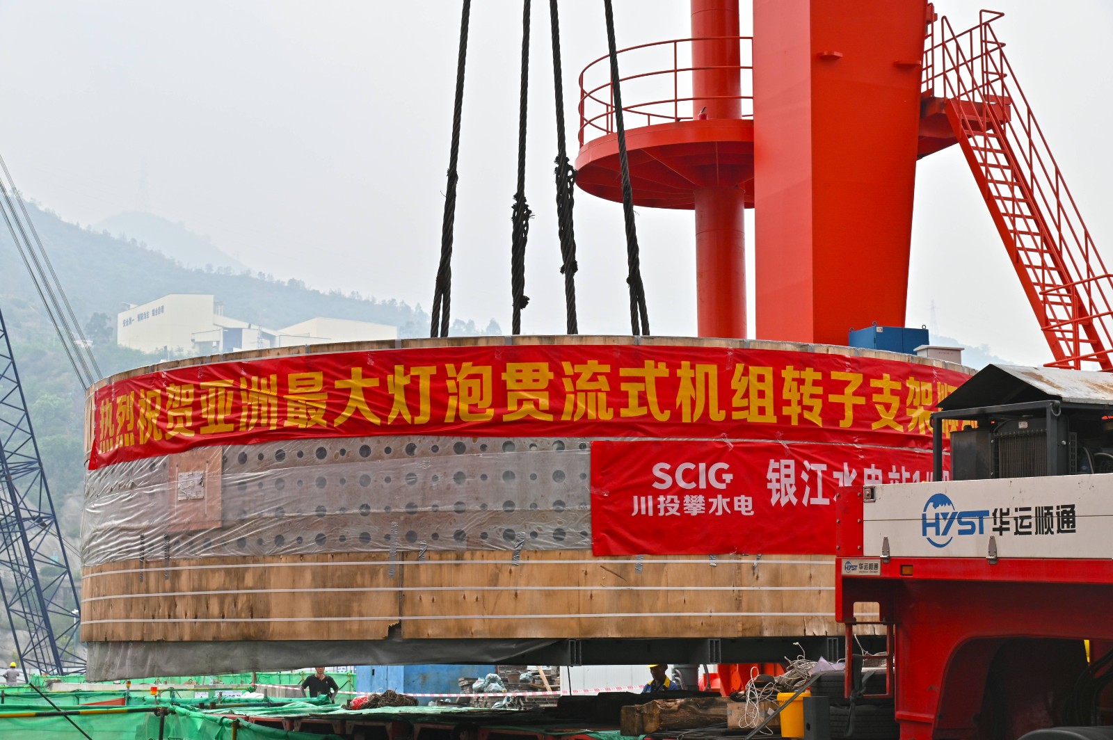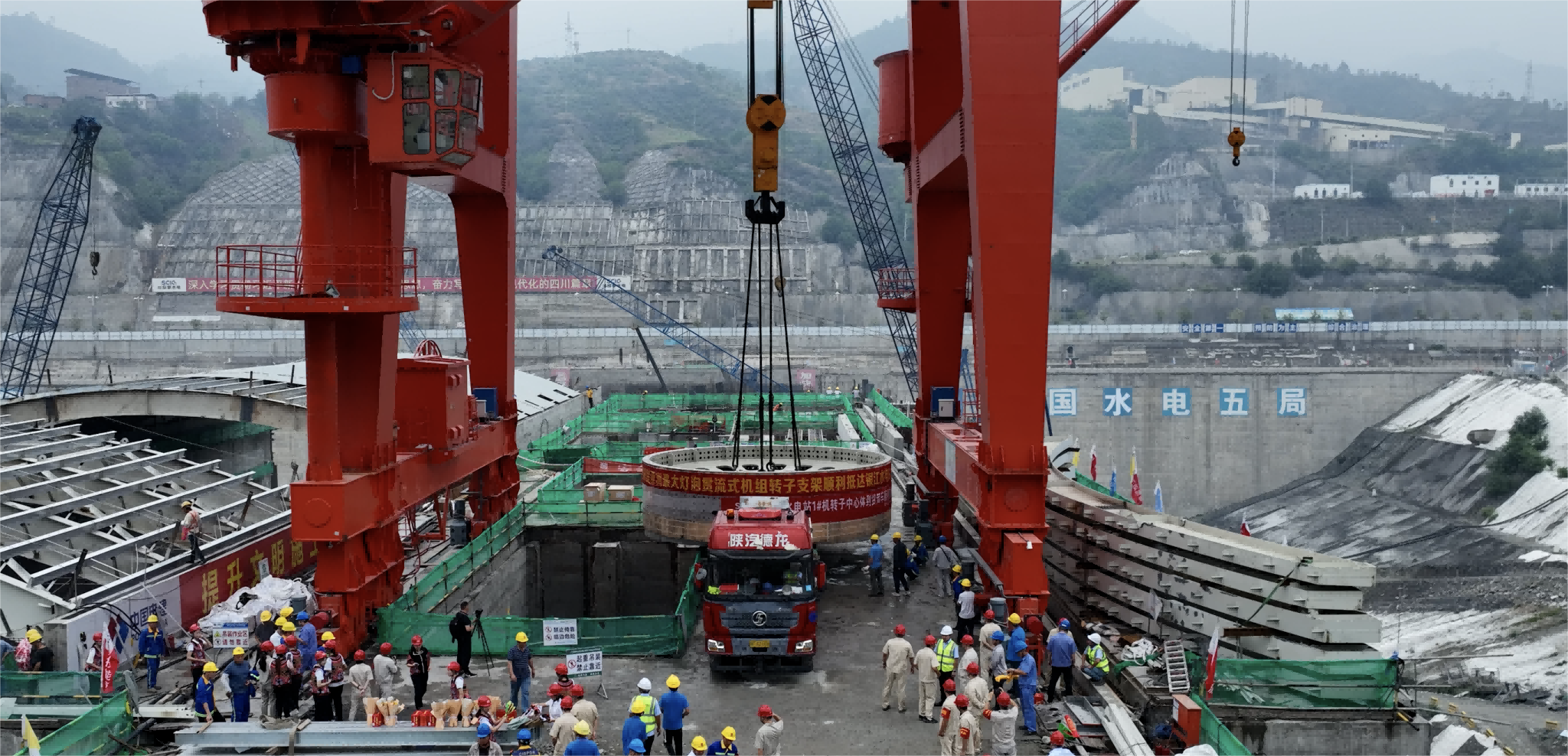 當日上午,攀水電公司和參建單位職工齊聚壩頂,共同迎接歷經(jīng)艱難、遠道而來的“重要成員”。據(jù)攀水電公司相關(guān)負責人介紹,該轉(zhuǎn)子支架具有設(shè)備巨大、運輸困難、作用重要三個特征。設(shè)備之“重”。轉(zhuǎn)子支架直徑達8米,高2米有余,重達百余噸,是目前亞洲最大的燈泡貫流式機組轉(zhuǎn)子支架。運輸之“難”。轉(zhuǎn)子支架于4月22日從江蘇鎮(zhèn)江碼頭開始運輸,先乘船再坐車,途中克服了大件超寬超限、持續(xù)降雨、道路塌方等諸多不利因素,多次調(diào)整運輸路線,風(fēng)雨無阻,日夜兼程,歷時66天,跨越7個省份,全程3062公里,在沿途交警的護送下安全抵達。作用之“要”。轉(zhuǎn)子支架作為機組的核心部件,為磁軛一體圓盤式結(jié)構(gòu),中心體采用整圓鍛鋼與磁軛圈焊接組成,對轉(zhuǎn)子磁軛垂直度、磁軛圓度等加工精度要求極高,決定著機組的運行性能、運行效率和安全穩(wěn)定性。