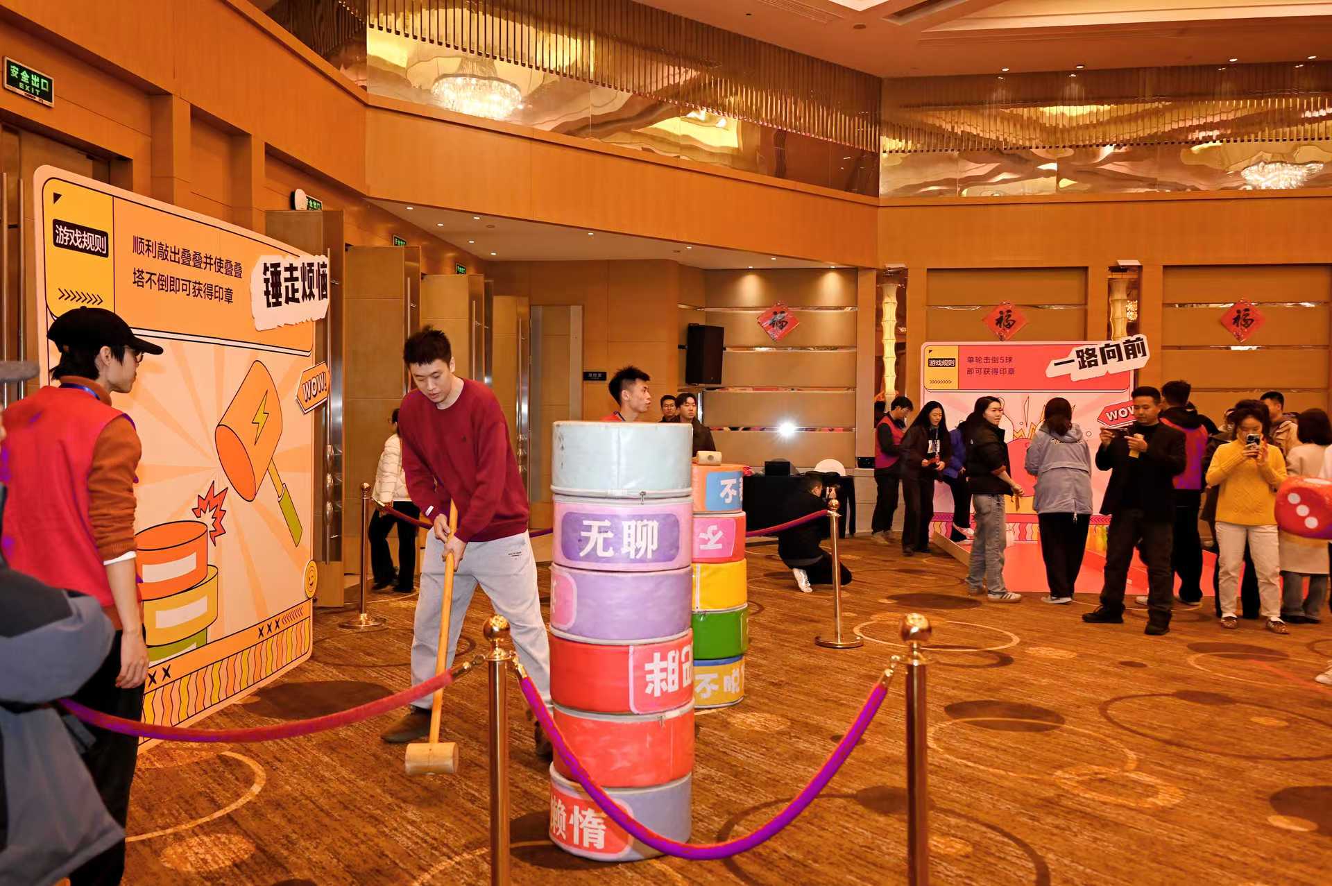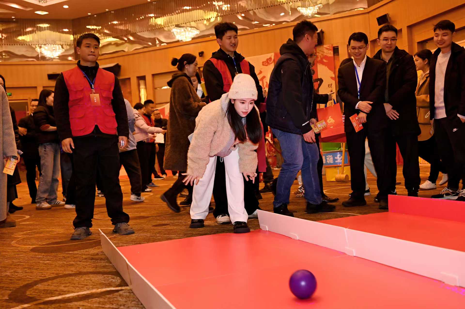 一路向前區(qū),職工們輪流上陣,用力擲出保齡球,體驗(yàn)運(yùn)動(dòng)的樂(lè)趣與激情;錘走煩惱區(qū),職工們通過(guò)敲擊“煩惱圈”,釋放壓力,享受智慧與技巧的碰撞 ;蛇舞新春區(qū),參賽者屏息凝神,用盡全力推動(dòng)小球,看它在賽道上蜿蜒;拼出未來(lái)區(qū),只見(jiàn)每位職工選手抱著不同顏色和形狀的“方塊”,構(gòu)建圖案并迅速完成拼裝。