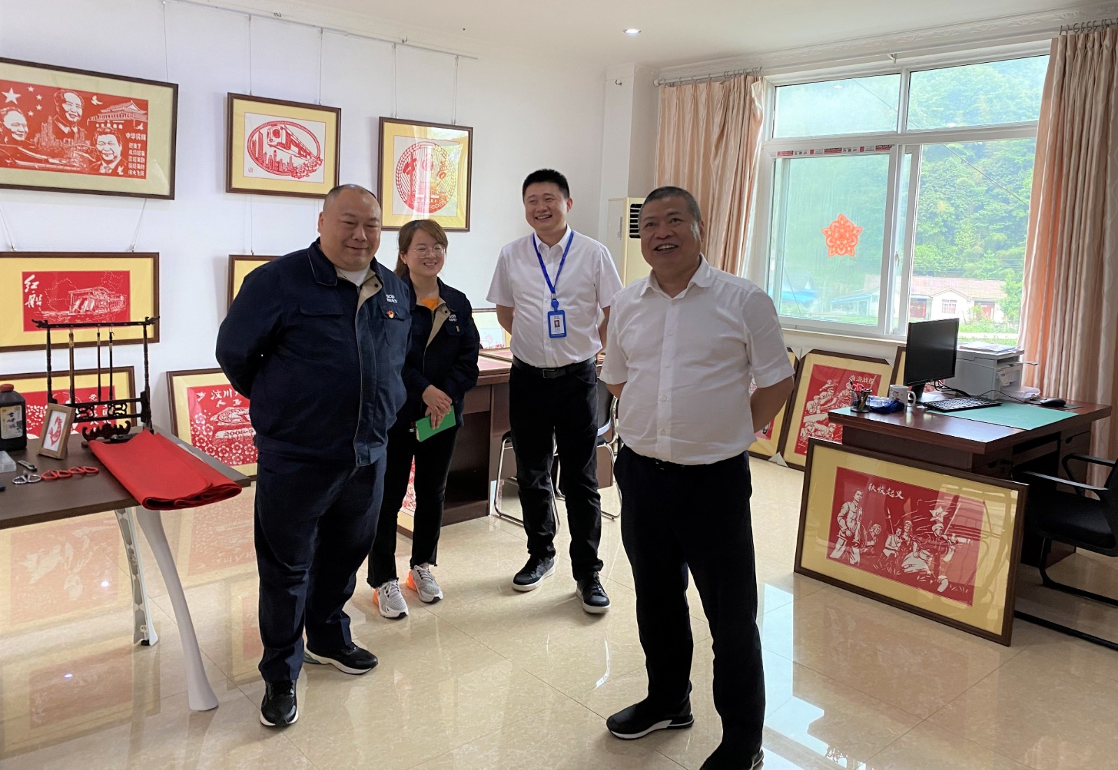 在“小莊工作室”,楊洪一行現(xiàn)場(chǎng)查看了剪紙作品創(chuàng)作進(jìn)展情況,對(duì)公司領(lǐng)導(dǎo)班子及剪紙展相關(guān)工作人員的共同努力表示了充分肯定,對(duì)莊叢燦及其團(tuán)隊(duì)表示了親切的慰問(wèn),并要求公司在后續(xù)工作中按集團(tuán)公司指示,高位謀劃、高效推動(dòng)、高質(zhì)量完成好剪紙展籌備工作。