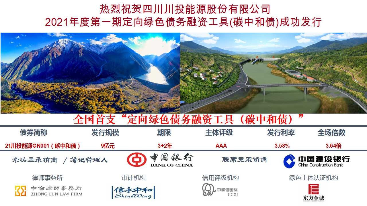 2021年7月15日,四川川投能源股份有限公司成功發(fā)行2021年度第一期定向綠色債務(wù)融資工具(碳中和債)(簡稱:21川能投GN001,代碼:q21071406.IB),本次發(fā)行金額9億元,期限3+2年,票面利率3.58%,屬目前同期限同定向債務(wù)融資工具的全國最低價格。募集資金將專項用于收購?fù)ぷ涌谒こ添椖?0%股權(quán)。