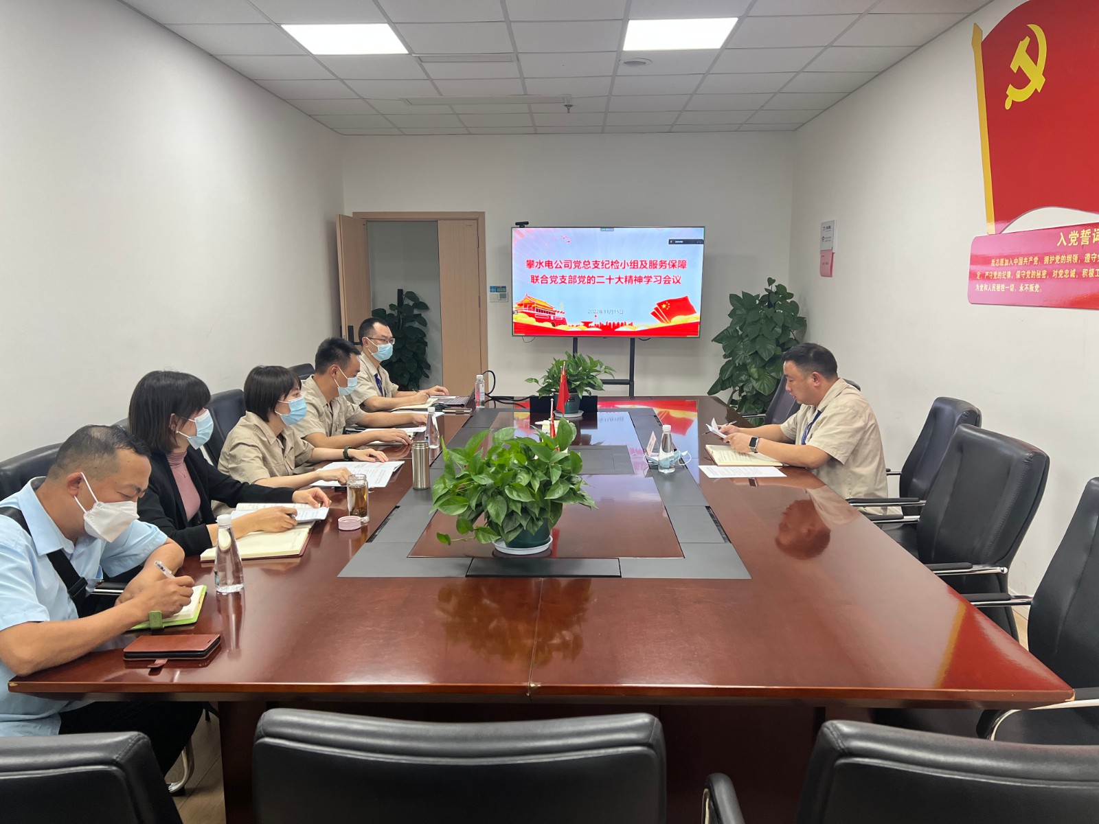 11月15日,攀水電公司黨總支紀(jì)檢小組長(zhǎng)楊銳組織紀(jì)檢小組成員及服務(wù)保障聯(lián)合黨支部黨員,采取原文學(xué)習(xí)、重點(diǎn)解讀、討論交流等形式,對(duì)黨的二十大報(bào)告、二十大關(guān)于《中國(guó)共產(chǎn)黨章程(修正案)》的決議以及十九屆中央紀(jì)律檢查委員會(huì)向黨的二十次全國(guó)代表大會(huì)的工作報(bào)告等重要文件進(jìn)行了再學(xué)習(xí)、再部署、再深入、再落實(shí)。楊銳強(qiáng)調(diào),紀(jì)檢小組成員一是要率先垂范、先學(xué)先悟,不斷提高政治判斷力、政治領(lǐng)悟力、政治執(zhí)行力;二是要提高站位、做實(shí)監(jiān)督,把學(xué)習(xí)貫徹黨的二十大精神作為當(dāng)前政治監(jiān)督的重中之重;三是要學(xué)以致用、解決問(wèn)題,切實(shí)用黨的二十大精神關(guān)于全面從嚴(yán)治黨的新要求、新舉措、新指示指導(dǎo)實(shí)踐、推動(dòng)工作;四是要立足崗位、堅(jiān)定履職,持之以恒推進(jìn)全面從嚴(yán)治黨,不折不扣落實(shí)監(jiān)督工作。