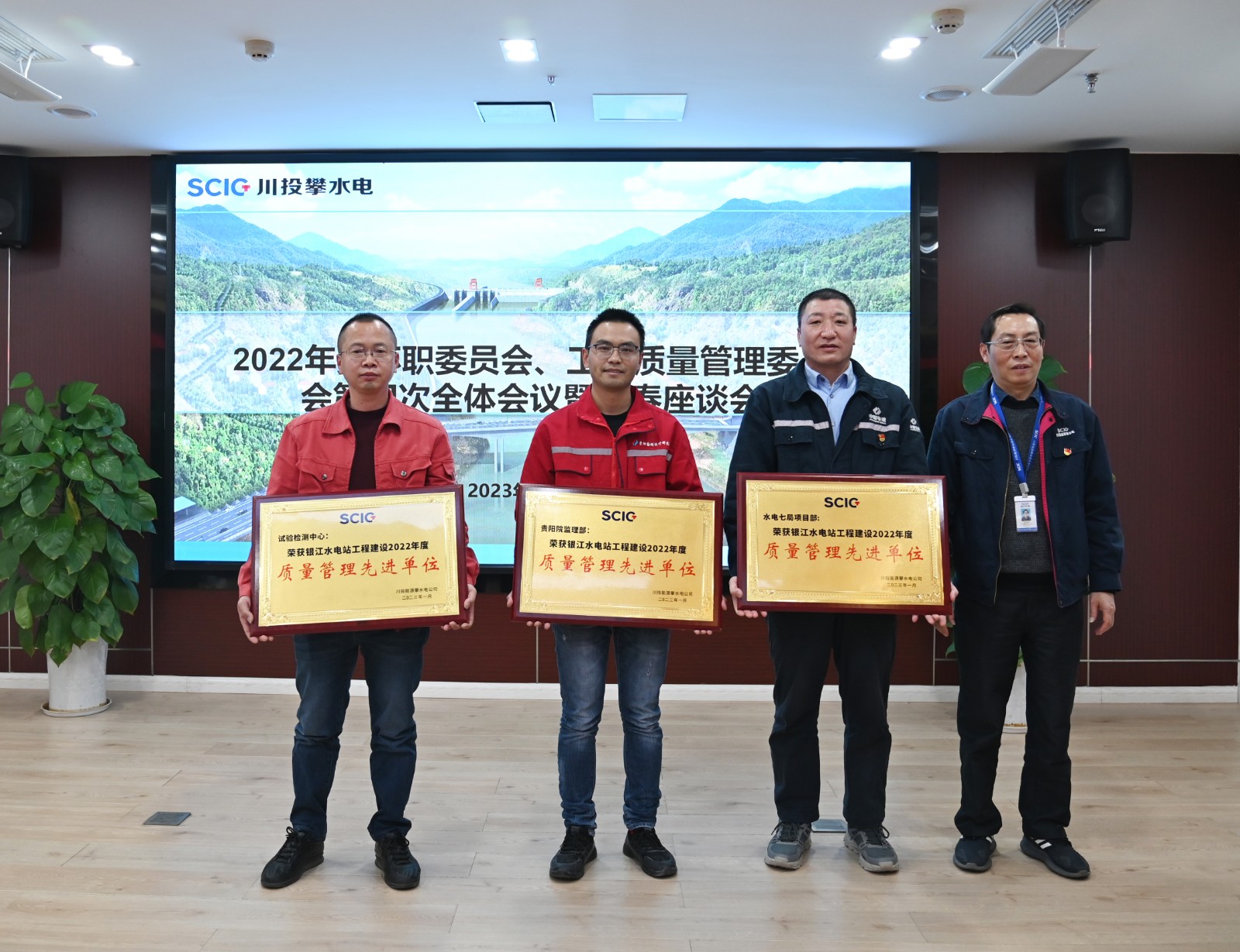 會上,公司黨總支副書記、董事會秘書、工會主席鄧勇宣讀了《關(guān)于表彰銀江水電站2022年度質(zhì)量管理先進(jìn)單位、先進(jìn)集體和先進(jìn)個人的通報》文件,徐孝剛向榮獲2022年度質(zhì)量管理先進(jìn)單位的試驗檢測中心、貴陽院監(jiān)理部、水電七局項目部頒發(fā)了獎牌,公司總經(jīng)理助理兼工程管理部經(jīng)理嚴(yán)瑞平向先進(jìn)集體代表頒發(fā)了獎牌。吳巍嶼組織參會人員向獲獎的單位、集體及個人表示了祝賀,要求其在今后的質(zhì)量管理工作中發(fā)揮好先鋒模范帶頭作用,促進(jìn)各參建單位共同提高質(zhì)量管理水平,把銀江水電站建設(shè)成“精品工程、樣板工程、陽光工程”。