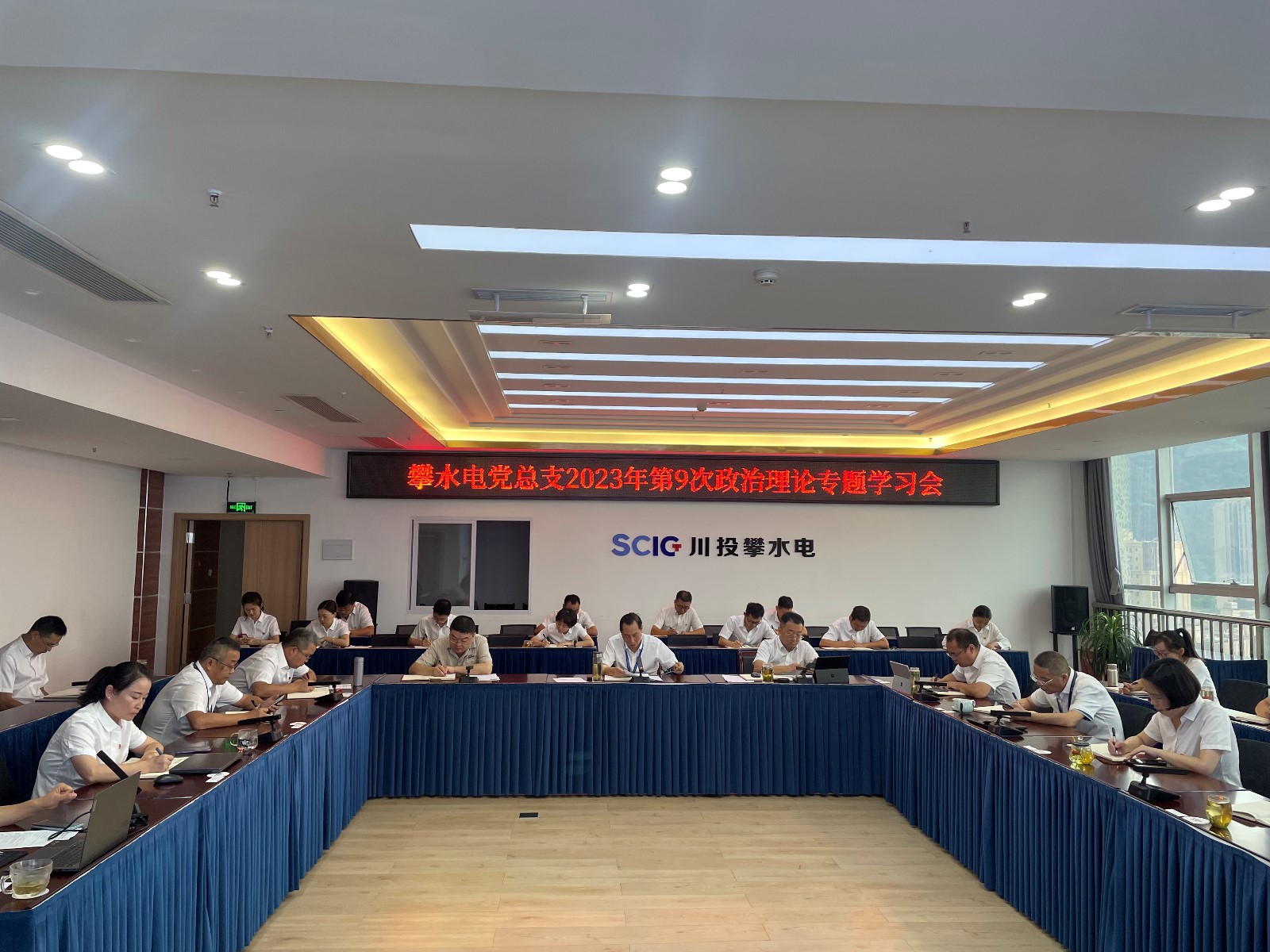 8月20日上午,攀水電黨總支召開2023年第9次政治理論學習(擴大)會,專題學習研討習近平總書記來川視察重要指示精神,川投能源副總經理、攀水電公司黨總支書記、董事長徐孝剛主持會議并帶頭談認識體會。黨總支政治理論學習會成員、全體黨員、非黨干部、入黨積極分子共30 余人參加學習。