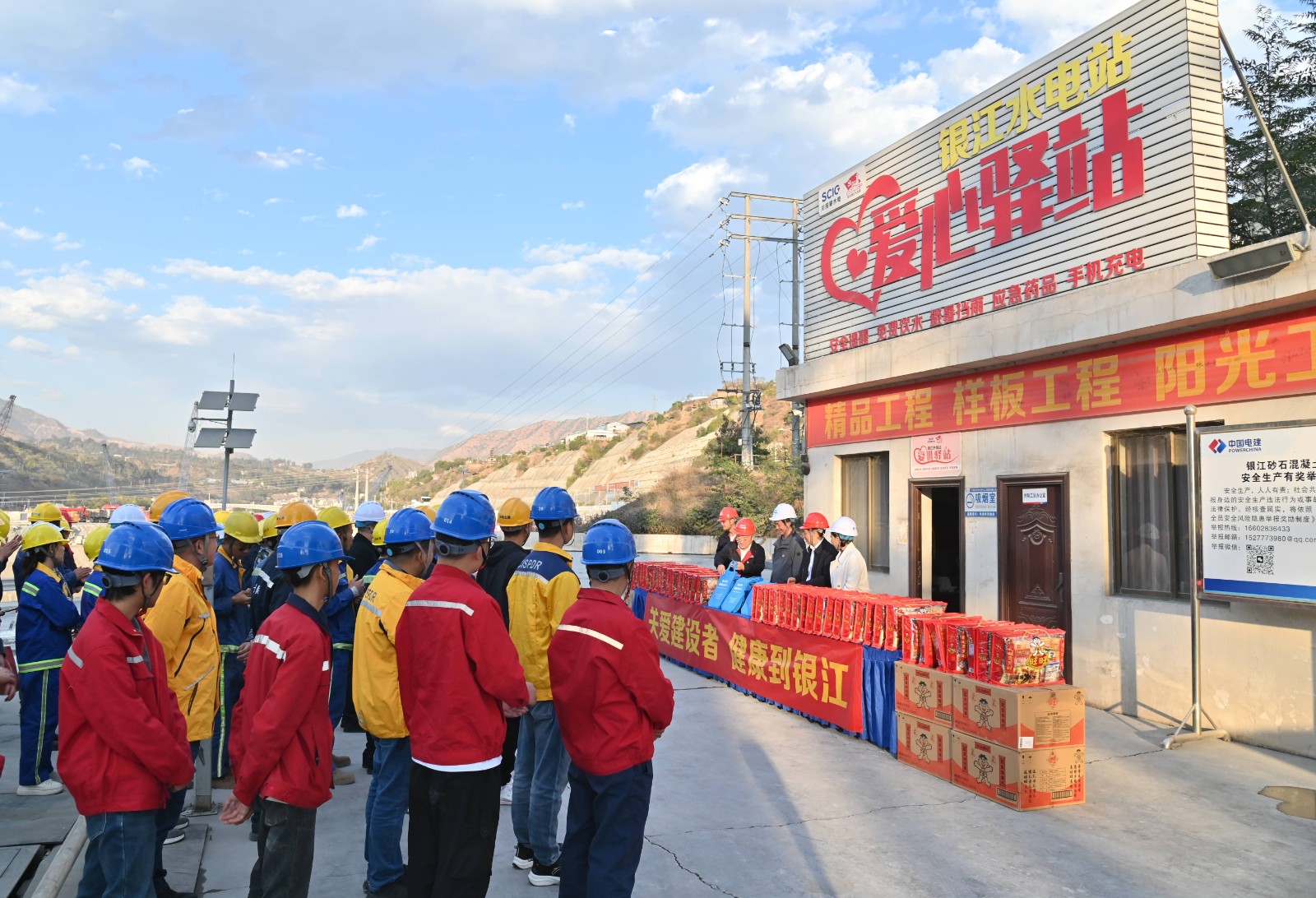 活動首先參觀了公司大黨建宣傳陣地和銀江水電站施工現(xiàn)場。在愛心驛站,黨員們?yōu)閬碜蚤L江設(shè)計院、貴陽院監(jiān)理部、水電五局項目部、水電七局項目部、廣東源天項目部等參建單位的工友發(fā)放了健康宣傳手冊、新春大禮包等慰問物品。田巨龍感慨到銀江水電站工程建設(shè)速度之快難以令人想象,囑咐工友們一定要保重身體、注意自身防護(hù),祝福工友們平平安安、健健康康迎接新年的到來。