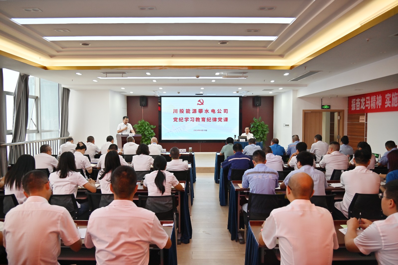 在全黨開展黨紀學習教育和黨的103歲生日來臨之際,按照川投能源黨委和攀水電黨總支的安排部署,6月30日上午,川投能源副總經(jīng)理、攀水電公司黨總支書記、董事長徐孝剛講授了黨紀學習教育紀律黨課并宣講省委十二屆五次全會精神,公司全體員工、參建單位負責人及黨員代表共計50余人參加。