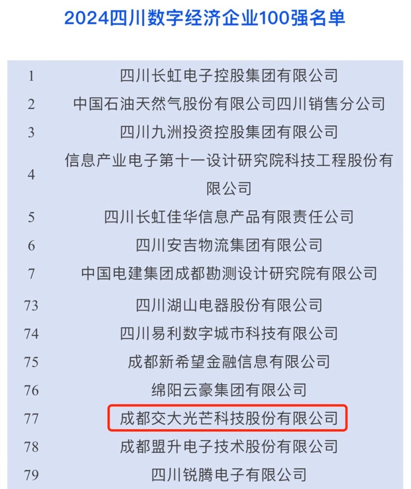 9月26日,四川大企業(yè)大集團發(fā)展大會在成都召開,會上,四川省企業(yè)聯(lián)合會發(fā)布了2024年四川企業(yè)100強、制造業(yè)100強、服務(wù)業(yè)100強和數(shù)字經(jīng)濟100強榜單,交大光芒榮登四川數(shù)字經(jīng)濟企業(yè)100強榜單,位列第77位。