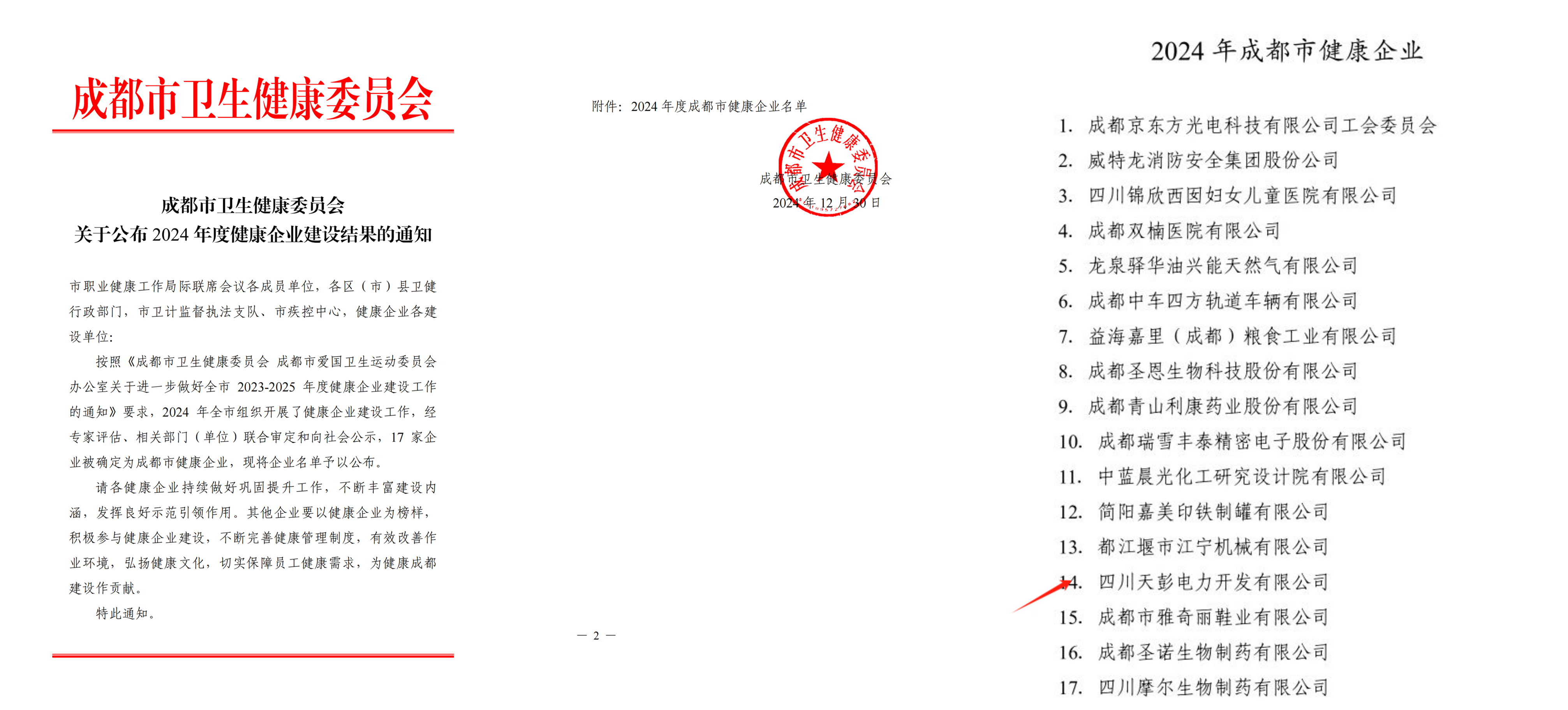 近日,成都市衛(wèi)生健康委員會(huì)公布2024年度健康企業(yè)建設(shè)結(jié)果,天彭電力公司順利通過(guò)專家組評(píng)審驗(yàn)收,被評(píng)為“2024年成都市健康企業(yè)”。