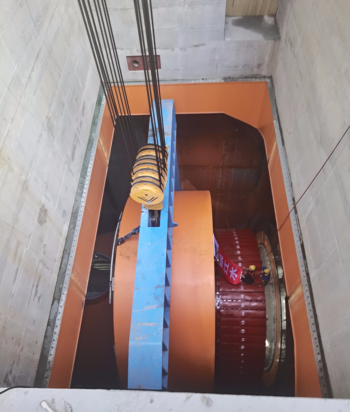 轉(zhuǎn)子與定子均是水輪發(fā)電機組核心部件,其裝配精度要求極高,本次吊裝過程堪稱機組安裝中技術最復雜、風險最高的環(huán)節(jié)之一;轉(zhuǎn)子總重約230.5噸,最大安裝直徑達8473.2毫米,由轉(zhuǎn)子支架、磁極、制動環(huán)及轉(zhuǎn)子引線等部件精密組裝而成;定子裝配則包括機座、內(nèi)支撐、鐵芯、線棒等,總重190.5噸,機座最大外徑達10400毫米,總起吊重量高達約228噸;為確保這兩個大件的吊裝工作萬無一失,攀水電公司協(xié)同參建各方提前周密部署,對橋機制動系統(tǒng)、吊具及轉(zhuǎn)子、定子本體狀態(tài)開展全維度細致檢查,同步落實現(xiàn)場安全技術交底,完成起吊設備調(diào)試、操作流程演練等準備工作,夯實安全基礎。