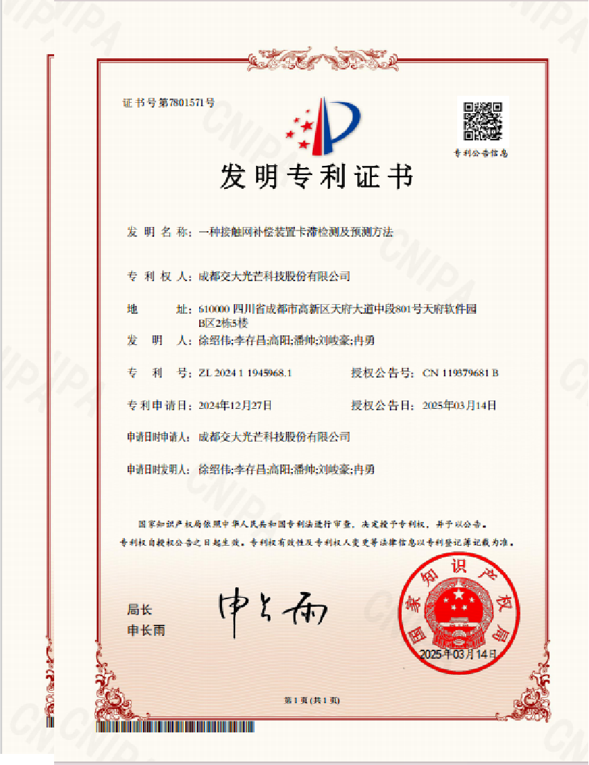 近日,川投能源所屬交大光芒公司“接觸網(wǎng)補(bǔ)償裝置卡滯檢測(cè)及預(yù)測(cè)方法”和“基于多維數(shù)據(jù)的列車(chē)融合定位方法”兩項(xiàng)創(chuàng)新技術(shù)獲得國(guó)家知識(shí)產(chǎn)權(quán)局發(fā)明專(zhuān)利授權(quán)。截至目前,交大光芒鐵路接觸網(wǎng)檢測(cè)監(jiān)測(cè)智能化相關(guān)創(chuàng)新技術(shù)累計(jì)獲得發(fā)明專(zhuān)利授權(quán)達(dá)到9項(xiàng),另有多項(xiàng)創(chuàng)新技術(shù)已申請(qǐng)發(fā)明專(zhuān)利并獲受理。