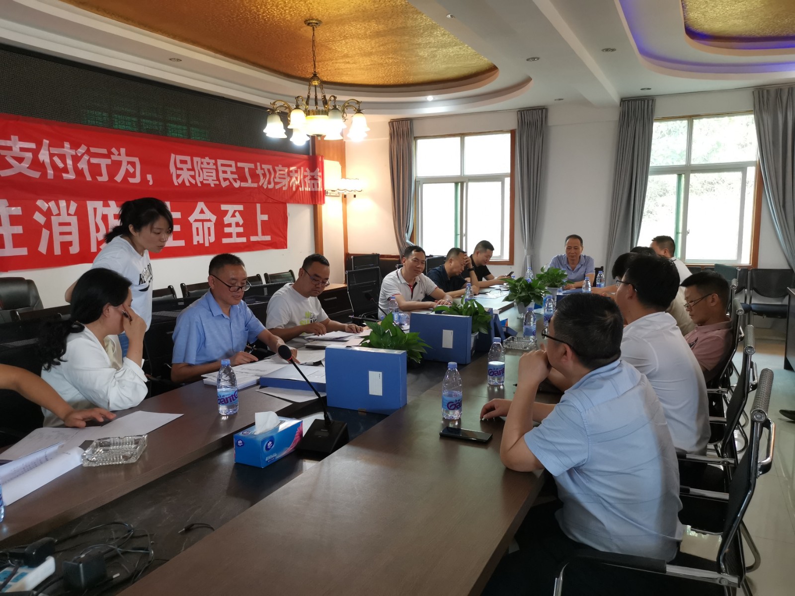 會(huì)議首先由攀水電公司計(jì)劃合同部經(jīng)理張興文匯報(bào)銀江水電站工程基本情況,葛洲壩路橋項(xiàng)目部副經(jīng)理周長(zhǎng)渝匯報(bào)銀江水電站右岸壩頂以上邊坡開挖支護(hù)工程基本情況,重點(diǎn)介紹了本項(xiàng)目農(nóng)民工實(shí)名制、工資支付方式、周期及支付總額等,并向檢查組展示了相關(guān)憑證材料。核查組成員在資料核查過程中,就葛洲壩路橋項(xiàng)目部提供的農(nóng)民工工資支付相關(guān)資料提出詢問,張興文、周長(zhǎng)渝等人逐一進(jìn)行了解答。