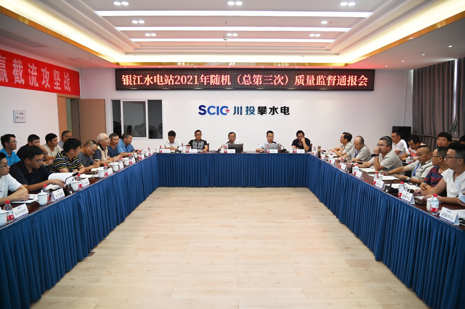 隨后,專(zhuān)家組對(duì)各參建單位的質(zhì)量管理體系建立和運(yùn)行情況、現(xiàn)場(chǎng)質(zhì)量驗(yàn)收情況及試驗(yàn)檢測(cè)情況等質(zhì)量管理內(nèi)業(yè)資料進(jìn)行了仔細(xì)核查并召開(kāi)了質(zhì)量監(jiān)督通報(bào)會(huì)。會(huì)上專(zhuān)家組根據(jù)現(xiàn)場(chǎng)工程質(zhì)量及質(zhì)量管理內(nèi)業(yè)資料的檢查情況,指出了工程質(zhì)量管理及現(xiàn)場(chǎng)施工過(guò)程中存在的問(wèn)題,并對(duì)各參建單位質(zhì)量管理工作及現(xiàn)場(chǎng)工程質(zhì)量提出了寶貴的意見(jiàn)和建議,要求各參建單位在會(huì)后立即自查自糾、舉一反三,結(jié)合本次檢查發(fā)現(xiàn)的問(wèn)題,按照“五定”原則認(rèn)真整改落實(shí)。劉學(xué)鵬指出,銀江水電站建設(shè)進(jìn)度是同類(lèi)型電站中的佼佼者,工程質(zhì)量管理體系健全,現(xiàn)場(chǎng)質(zhì)量管理工作井然有序,工程質(zhì)量總體較好。他指出,一是各參建單位要繼續(xù)提高質(zhì)量管理意識(shí),杜絕發(fā)生質(zhì)量事故,降低質(zhì)量通病發(fā)生率;二是各參建單位要做好雨季施工措施,落實(shí)防洪度汛方案及應(yīng)急預(yù)案,保證混凝土澆筑質(zhì)量,確保銀江水電站安全度汛。