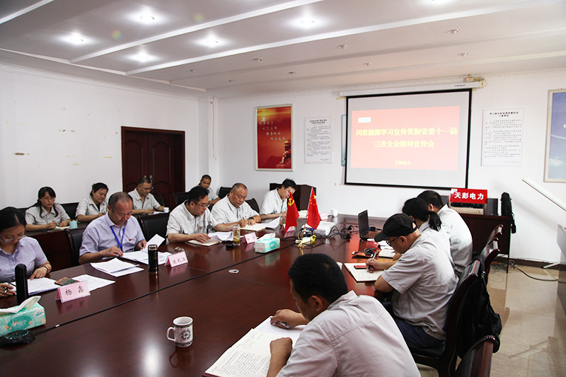 為推動(dòng)省委十一屆三次全會(huì)精神宣貫活動(dòng)深入開(kāi)展,確保省委決策部署不折不扣落到實(shí)處, 8月8日,按照川投能源黨委的統(tǒng)一部署,黨委副書記、工會(huì)主席陳長(zhǎng)江率黨群部副主任楊鑫一行赴天彭電力宣講省委十一屆三次全會(huì)精神,為天彭電力黨員干部和員工上了一堂生動(dòng)的黨課。會(huì)議由天彭電力黨總支書記、總經(jīng)理?xiàng)顫鞒郑炫黼娏θw干部、黨員和員工代表共計(jì)28人參加了宣講會(huì)。