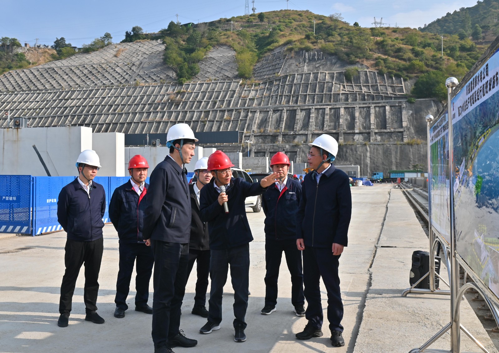 鄧超一行深入銀江水電站項(xiàng)目施工現(xiàn)場(chǎng),實(shí)地查看了大壩壩頂、中控室、安裝間等區(qū)域安全生產(chǎn)情況,并現(xiàn)場(chǎng)聽(tīng)取了攀水電公司關(guān)于工程建設(shè)、生產(chǎn)運(yùn)行、安全環(huán)保等工作落實(shí)情況的匯報(bào)。