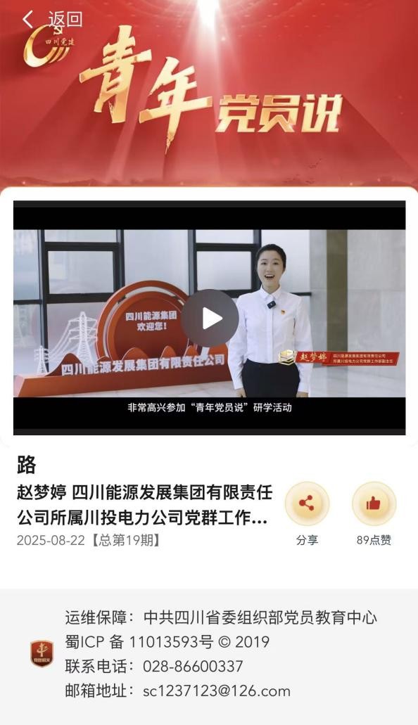 近期,四川省委組織部舉辦的“青年黨員說”研學(xué)活動正在四川黨建官網(wǎng)等平臺集中展播。省國資委黨委共推薦10名青年黨員代表圍繞“學(xué)習(xí)新思想,爭當(dāng)改革先鋒”為主題,談體會、談感悟。其中,由四川能源發(fā)展集團上報、川投能源推薦的作品《路》,通過講述“兩路”精神的歷史內(nèi)涵,結(jié)合川投電力腳基坪電廠震后緊急搶險、天彭電力鳳鳴湖水庫飲水廊道清淤、玉田電廠為涼山州彝族村民送水送電等鮮活事例,展現(xiàn)能源人在逆行搶險、為民服務(wù)和民族團結(jié)中的責(zé)任擔(dān)當(dāng),號召新時代國企人賡續(xù)“兩路”精神,汲取奮進力量,展現(xiàn)了能源國企的使命擔(dān)當(dāng)。