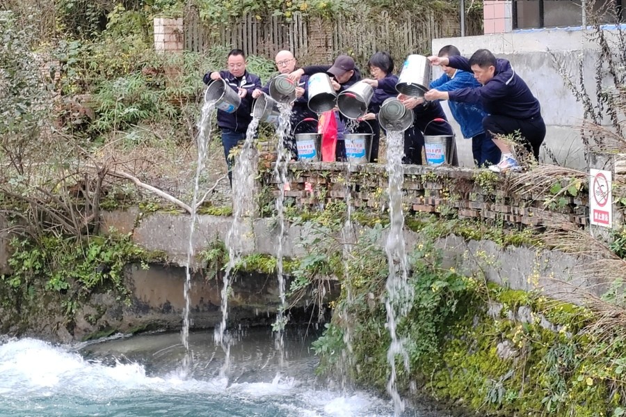 11月14日,在屬地政府、主管部門及當(dāng)?shù)厝罕姽餐娮C下,10000尾重口裂腹魚苗,從鳳鳴湖大壩上游匯入了清澈見底的沙金河。